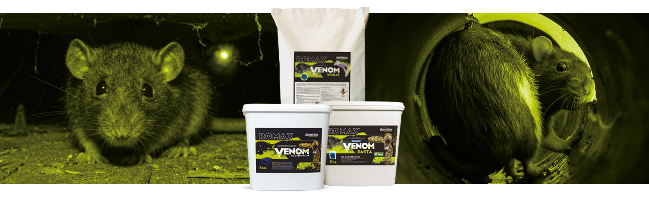 The Romax® Venom range also features a full compliment of traditional bait formats, including wax blocks, pasta sachets and whole wheat grains. The entire range is produced using the highest quality ingredients with performance in mind, all at 50ppm and extensively trialled and tested in the field over the last ten years.